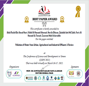I was honored to receive the Best Paper Award for my paper titled "Pollution of Water from Urban, Agricultural, and Industrial Effluent: A Review" at the Conference of Science and Development in Yemen (CAST 2022).