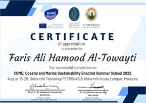 I have successfully completed the COME: Coastal and Marine Sustainability Enacted Summer School 2022 at Universiti Teknologi PETRONAS & Universiti Kuala Lumpur, Malaysia. This experience has significantly expanded my knowledge in coastal and marine sustainability, a critical area for the preservation of coastal ecosystems and habitats.